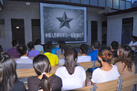 7月15日晚,廣通之家的小院內(nèi)座無虛席,黃陵縣店頭鎮(zhèn)文化站的同志正在為觀眾們播放紅色經(jīng)典電影《地雷戰(zhàn)》和《東進序曲》,經(jīng)典的電影片段不時博得現(xiàn)場觀眾的熱烈掌聲和陣陣歡笑。